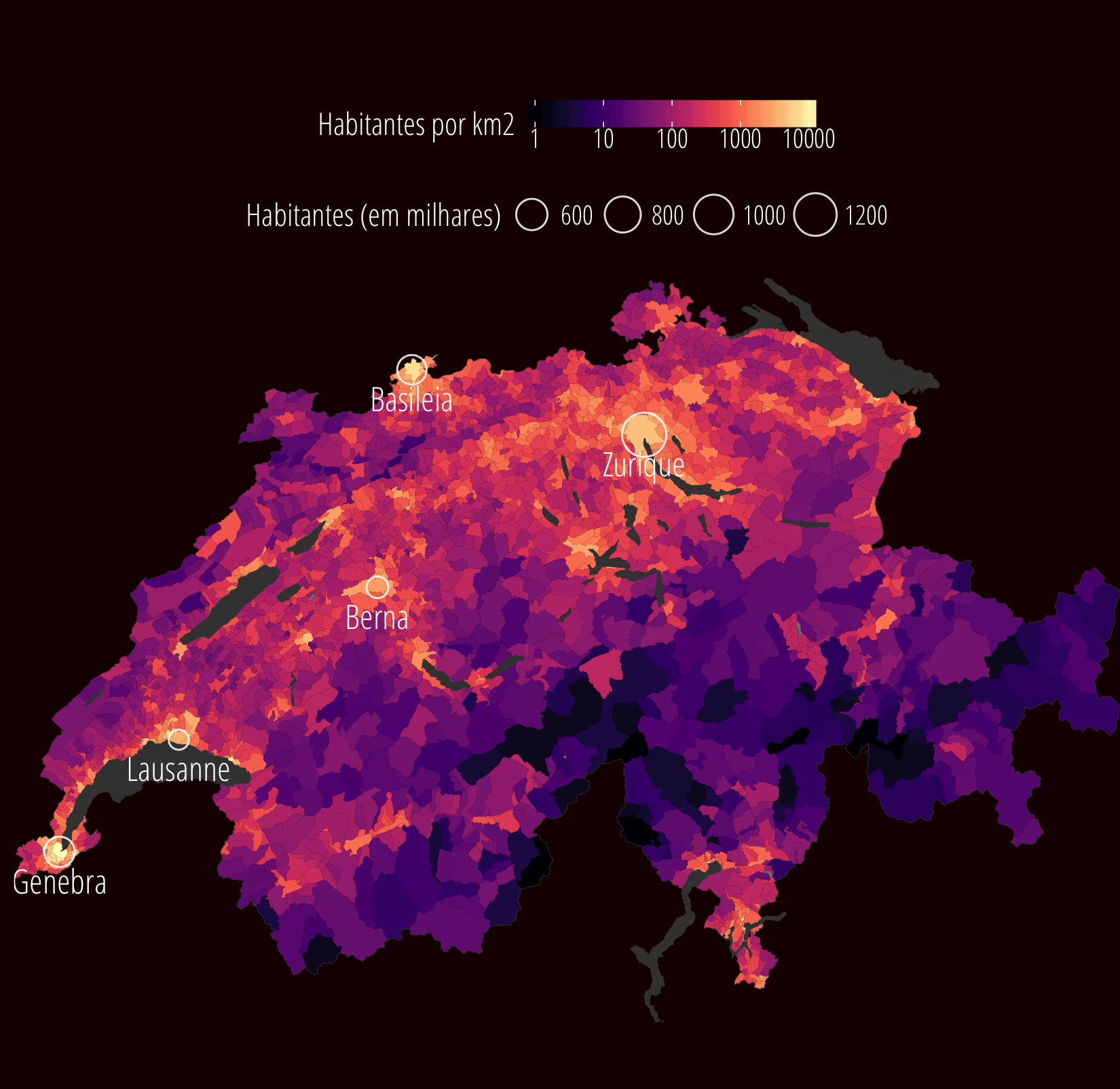 As cidades suíças estão coloridas de acordo com a densidade da população. O mapa mostra as cinco maiores cidades e sua população